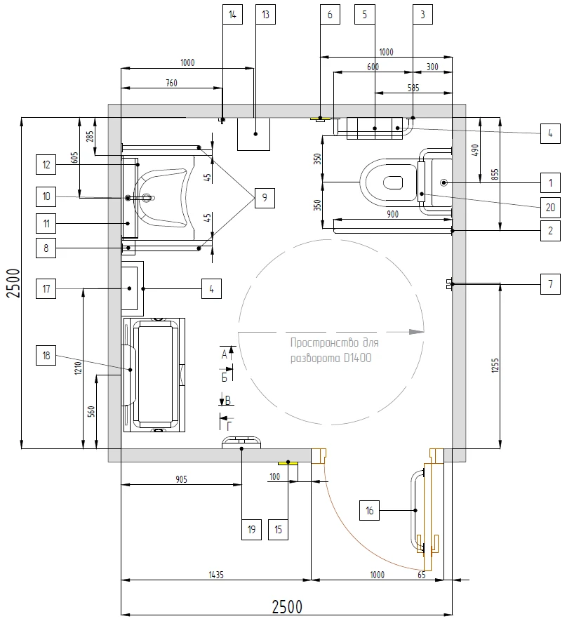 В соответствии с действующими нормами СП 59.13330.2020 санузел должен быть адаптирован для инвалидов специализированным оборудованием (все необходимое учтено в наборе!).
