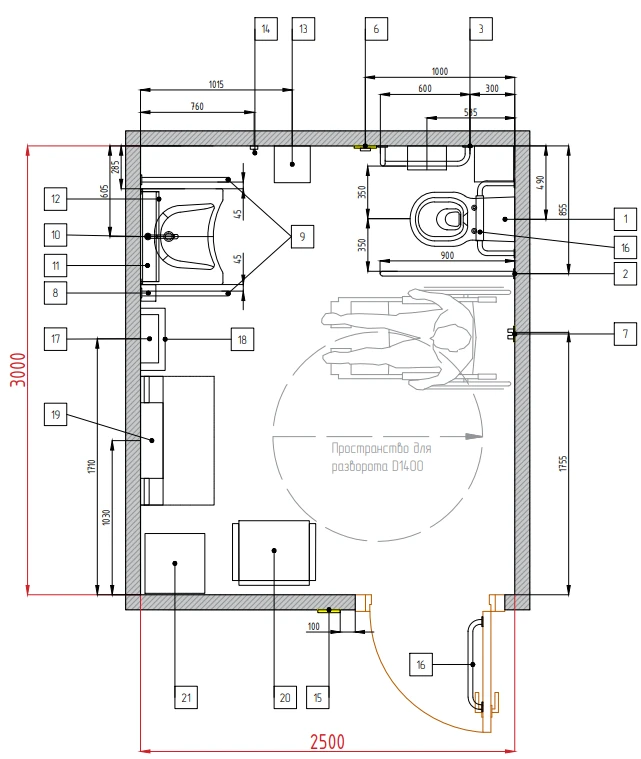 В соответствии с действующими нормами СП 59.13330.2020 санузел должен быть адаптирован для инвалидов специализированным оборудованием (все необходимое учтено в наборе!).