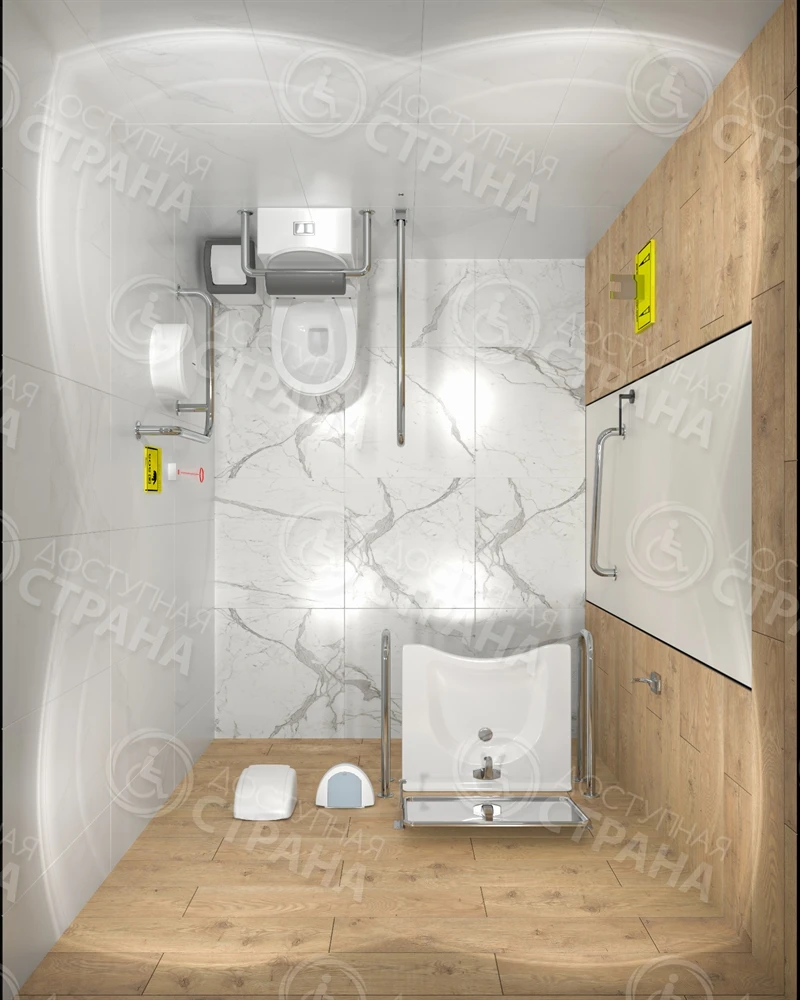 В соответствии с действующими нормами СП 59.13330.2020 санузел должен быть адаптирован для инвалидов специализированным оборудованием (все необходимое учтено в наборе!).