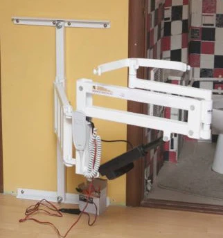 Настенный подъемник незаменим для оборудования малогабаритных квартир, перемещает в ванную комнату без заезда кресла-коляски в узкие дверной проём. Не портит интерьер.