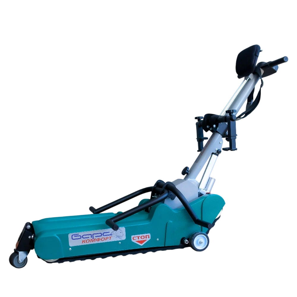 Барс Comfort (БАРС-УГП-130-комфорт) представляет собой автономное мобильное устройство с автоматизированным электро-механическим приводом для установки инвалидной коляски с пациентом. Подъемник оснащен электровыдвижным передним колесом, что облегчает маневрирование на узких лестничных площадках. Управление лестницеходом осуществляется с помощью переключателей, расположенных на рулевой колонке. Резиновая гусеничная лента с ребристым протектором обеспечивает надежное сцепление с любыми типами лестничных ступеней и покрытием.