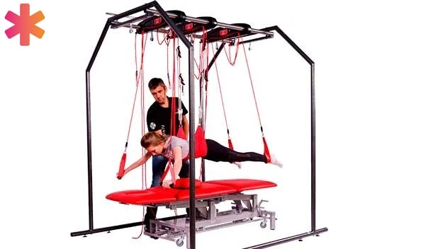 - Базовая комплектация обеспечивает широкие возможности в облегчении движений в открытых кинематических цепях (маховые движения), когда гравитация уменьшена за счет подвешивания конечностей за одну точку фиксации. Эта комплектация позволяет подвешивать руки и ноги, таз и грудную клетку, а также голову в нужном положении.