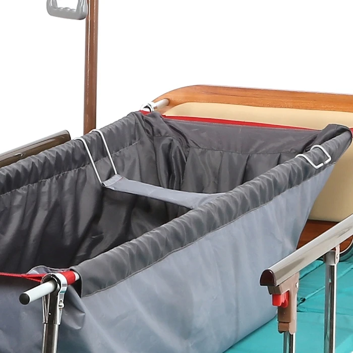 Каркасная складная ванна-простыня для купания больных в постели MET - санитарное приспособление для мытья лежачего больного в постели. Водонепроницаемый материал и специальная опора не позволяют воде намочить постель. Подголовник, закрепляющийся на каркасе ванны, поддерживает голову больного, не допуская погружения в воду. Для слива воды используется специальное отверстие с гибким пластмассовым шлангом.