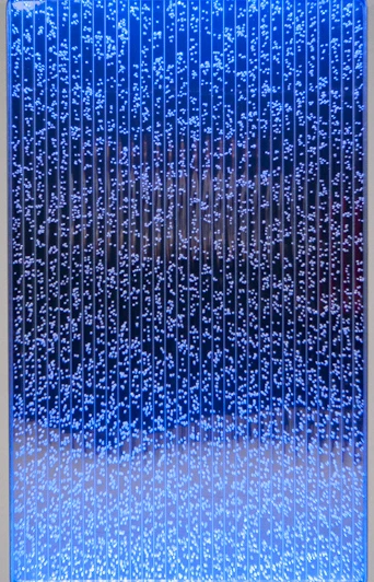 Воздушно-пузырьковая панель представляет собой плоскую панель из поликарбоната, разделённую на вертикальные камеры. В каждой камере индивидуальное сопло для подачи воздуха. По бокам панели сделана светодиодная RGB-подсветка. Управление подсветкой осуществляется при помощи пульта ДУ.Верхняя планка панели изготовлена из металла.